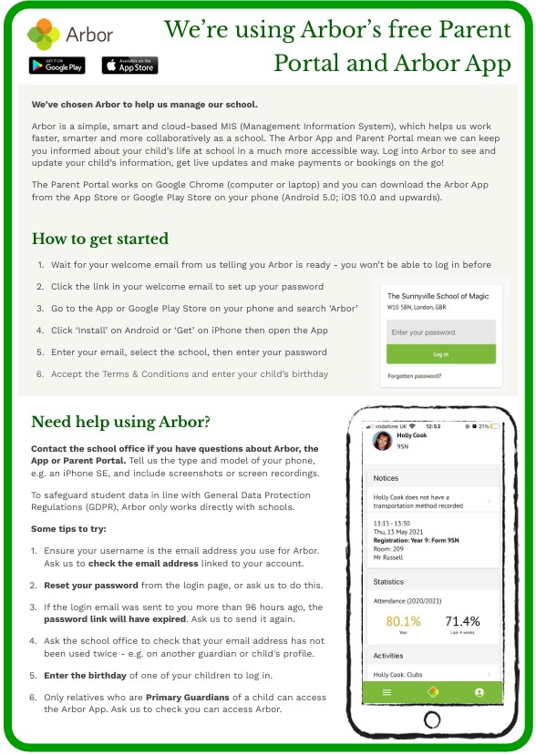 Arbor is a simple, smart and cloud-based MIS (Management Information System), which helps us work faster, smarter and more collaboratively as a school. The Arbor App means we can keep you informed about your child’s life at school in an accessible way. The Arbor App is our primary method of communication and will be where you track academic progress, attendance and behaviour information.