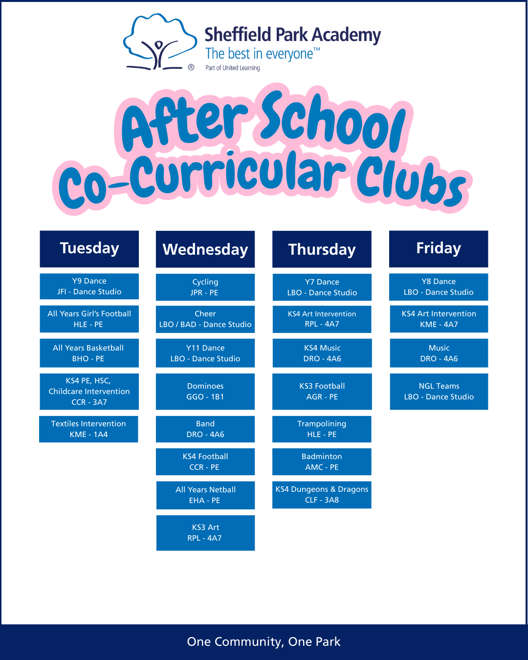 These consist of a varied programme of extra-curricular activities for students. Organised clubs include a morning breakfast club, dance, cheerleading, numerous sporting activities, the Duke of Edinburgh scheme, revision classes, music, homework clubs and subject booster sessions.